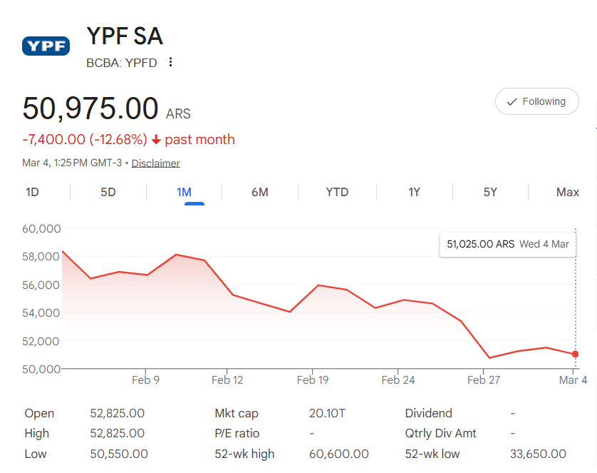 En el contexto de la guerra, YPF debería ser uno de los activos más beneficiados en el corto por la suba del crudo, aunque con matices importantes en el mercado local. La acción YPFD (en BYMA) y sus ADRs en Wall Street reaccionaron positivamente al shock energético: el lunes 2 de marzo, los ADRs cerraron con ganancias de +4-7% en promedio (frente a caídas generales en energéticas globales mixtas), impulsados por la percepción de que precios más altos del petróleo fortalecen los ingresos por exportaciones de crudo y shale de Vaca Muerta. En la jornada del martes, las subas se moderaron pero se mantuvieron positivas (+2-4% en algunos momentos), mientras el Merval caía por aversión al riesgo general. Sectores energéticos locales como YPF, Vista y Pampa Energía fueron de los pocos en verde o estables, contrastando con bancos y consumo que lideraron las bajas.